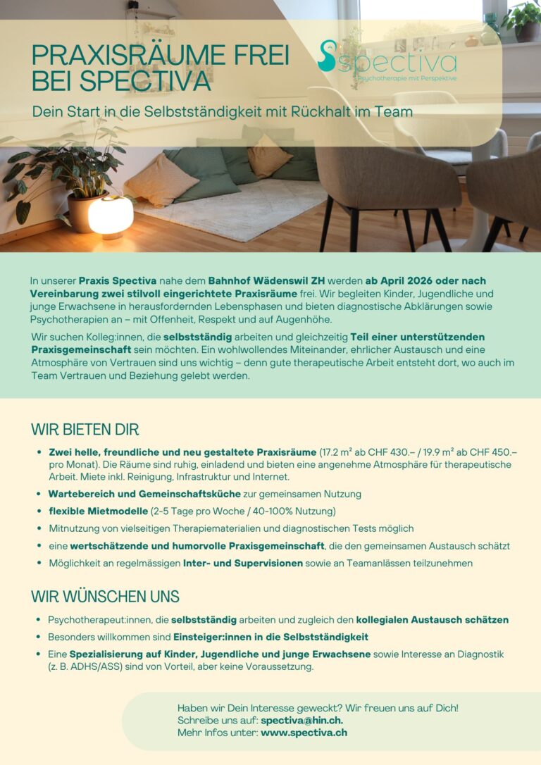 Die Spectiva stellt zwei helle und gemütlich eingerichtete Praxisräume zur Untermiete für Psychotherapeut:innen zur Verfügung. Die Räume bieten eine ruhige, angenehme Atmosphäre und eignen sich ideal für therapeutische Gespräche.